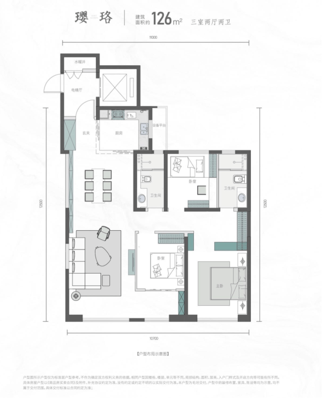 主卧面宽 3.3 米,朝南向,采光充足,摆放 1.8 米大床和双开门衣柜后仍有充足活动空间,搭配全景飘窗,不仅增加了使用空间,还能让业主在睡前醒来都能欣赏到窗外的园林美景。次卧面宽 2.9 米,同样朝南向,采光良好,可依据需求布置成儿童房或客房,儿童房放置 1.2 米床和书桌,满足孩子的学习和休息需求;客房则能为亲友来访提供舒适的居住空间。