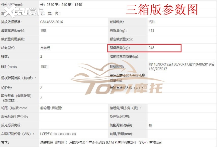 单从外观上看,标准版也同样采用了前19英寸后17英寸的车轮,具体规格前110/80R19后150/70R17,也没有了钢丝条幅轮圈和多功能轮胎。并且取消了发动机下护板和双撑大架,值得一提的是标准版也同时申报了配备三箱版本的图片。